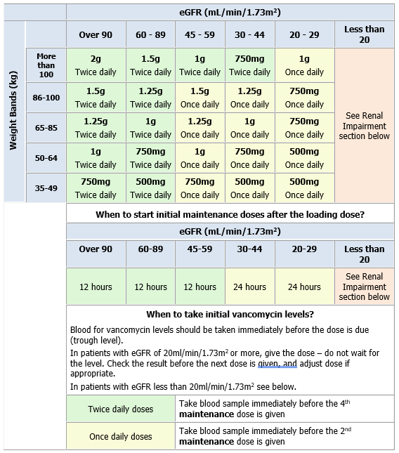 Use the table below to select the correct loading dose for patients 35kg or above with an eGFR of 20mL/min/1.73m2 or more. For patients weighing under 35kg, contact Micro/ID.