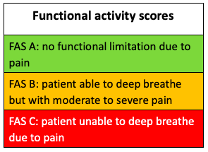 We also now use the Functional Activity Score to assess the impact of pain on function. The function measured is related to the surgery or injury: we may want to assess a patient's ability to comply with physiotherapy after a knee replacement, or the ability to take a deep breath and cough in a patient with rib fractures, as in the example below.