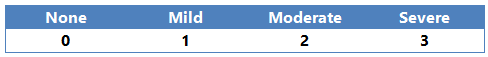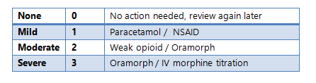 The patient is asked if they have pain and, if so, is it mild, moderate or severe. This is then recorded as a 0-3 score: