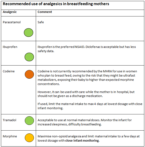 In the OUH, dihydrocodeine is currently the preferred weak opioid for breastfeeding mothers. It should be used at the lowest dose for the shortest time.