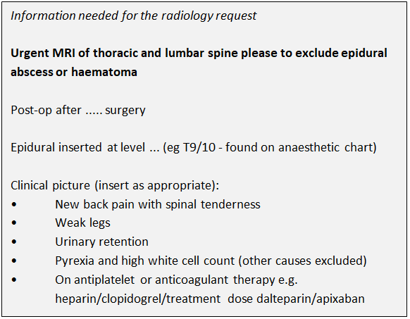 Contact the on call radiology consultant. If there is a contraindication to MRI, discuss with the radiologist what might be a reliable alternative to exclude an epidural abscess or haematoma.