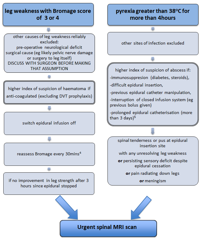 Remember that the presentation of an epidural haematoma or abscess can be very variable so this should be used as a guide. Sensory disturbances would also increase the level of suspicion. If concerned, discuss with a consultant anaesthetist, although this MUST NOT delay an urgent MRI scan if felt to be strongly indicated.